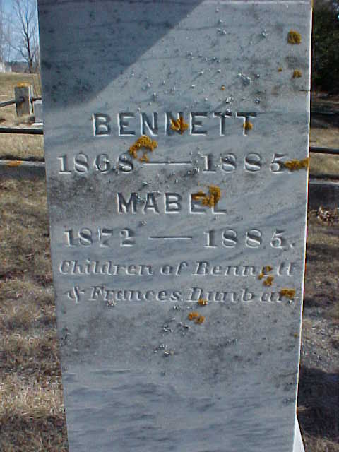 [monument South] D / BENNETT DUNBAR / 1828-1919 / FRANCES / wife of / BENNETT DUNBAR / 1832-1899 / DUNBAR [monument West] BENNETT / 1868-1885. / MABEL / 1872-1885. / Children of Bennett / & Frances Dunbar [monument North] DAVID / 1881-1938 [monument East] AUSTIN / 1876-1898 / Co. C. 9th Mass. Vols. / Buried at sea [footstone] MABEL |