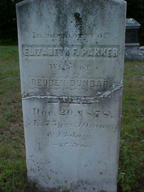In memory of / ELIZABETH F. PARKER / Wife of / REUBEN DUNBAR / DIED / Dec. 20. 1878. / Æ. 75 yrs. 10 mos. / & 14 days. | |