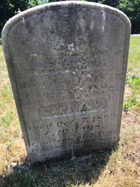 [headstone] GEORGE S. / died Nov. 15, 1877. / Æ 4 ys. 9 ms. 18 ds. / CARRIE M. / died Oct. 7, 1869. / Æ 10 days. / Children of F. B. & Frances C. Dunham. / Of such is the Kingdom of Heaven [footstone] G.S.D. |