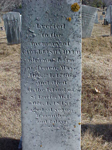 Erected / to the / memory of / CAPT. ELISHA DYER / who was born / at Truro, Mass. / Dec. 24, 1766; / and died / at the Island of / St. Lucia, W.I. / Oct. 1, 1818; / aged 51 years, / 9 months, / and 7 days. |