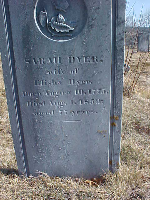 SARAH DYER, / wife of / Elisha Dyer, / Born August 10, 1775, / Died Aug. 1, 1852, / aged 77 years. | |